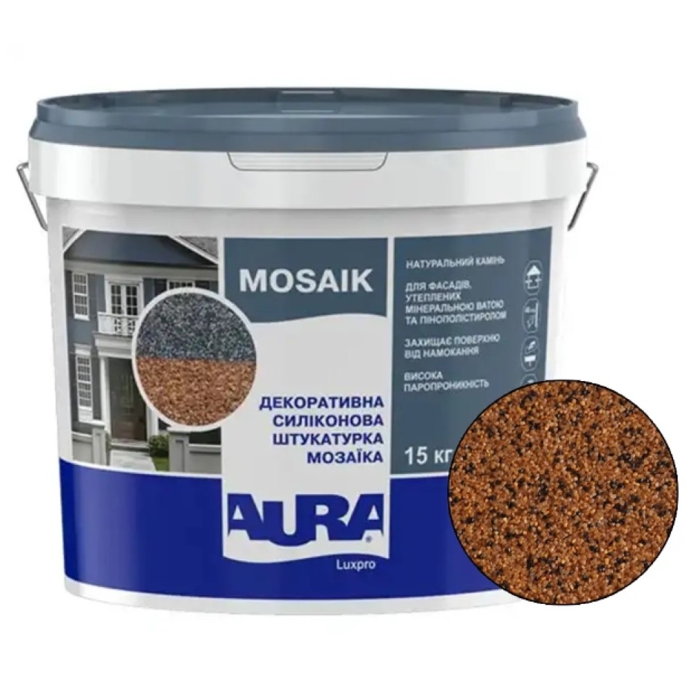 Aura Luxpro Mosaik — це готова до застосування декоративна мозаїчна штукатурка на акриловій основі, модифікована силіконом та з натуральним кам'яним наповнювачем. Вона призначена як для зовнішніх, так і для внутрішніх робіт. Завдяки своїм властивостям, вона особливо підходить для поверхонь, що піддаються високим експлуатаційним навантаженням та впливу атмосферних опадів, таких як цоколі будівель, промислові зони, а також стіни сходових маршів усередині приміщень.