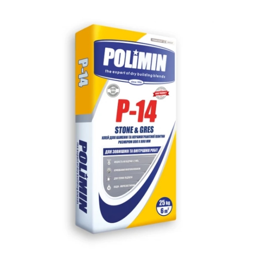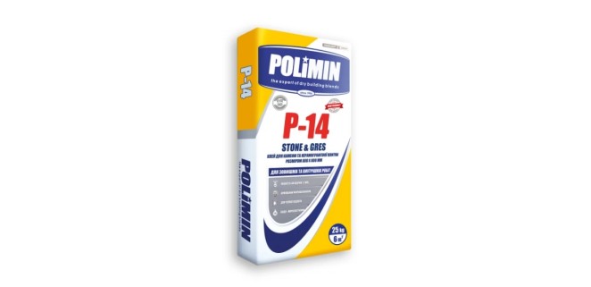 Плитковий клей Полімін П 14 — клейова суміш, що володіє підвищеною адгезією, призначена для кладки облицювальних покриттів великих габаритів і з низьким водопоглинанням (від 0,2%). Полімін П 14 використовують для укладання підлогових і настінних покриттів на міцні вихідні підстави (бетонні, цегляні, оштукатурені, не піддаються деформації та не мають дефектів у вигляді крихких ділянок). Цей тип клею для плитки морозостійкий, також він нормально переносить підвищену вологість під час експлуатації, тому його можна використовувати для робіт в приміщеннях і зовні.