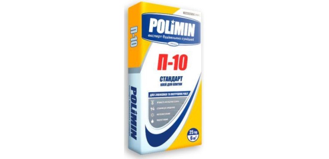 Клей Полімін П-10 - Клейова суміш призначена для вкладання керамічних та інших облицювальних матеріалів з водопоглинанням не менше 3%, розміром не більше 400х400 мм на бетонних, цегляних і оштукатурених основах, що не деформуються, всередині та зовні будівель.