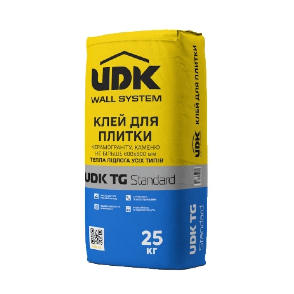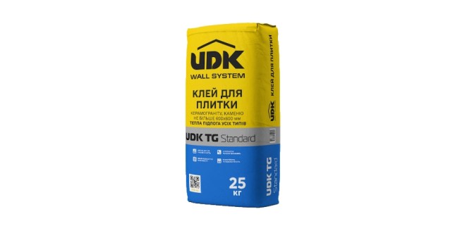Клей для плитки UDK TG Standard (25 кг) – це універсальний сухий клеєвий розчин на основі цементу, мінеральних наповнювачів та полімерних модифікаторів. Призначений для облицювання керамічною плиткою стін і підлог у житлових, комерційних та промислових приміщеннях. Завдяки покращеним характеристикам забезпечує високу міцність зчеплення, довговічність покриття та комфортність роботи.