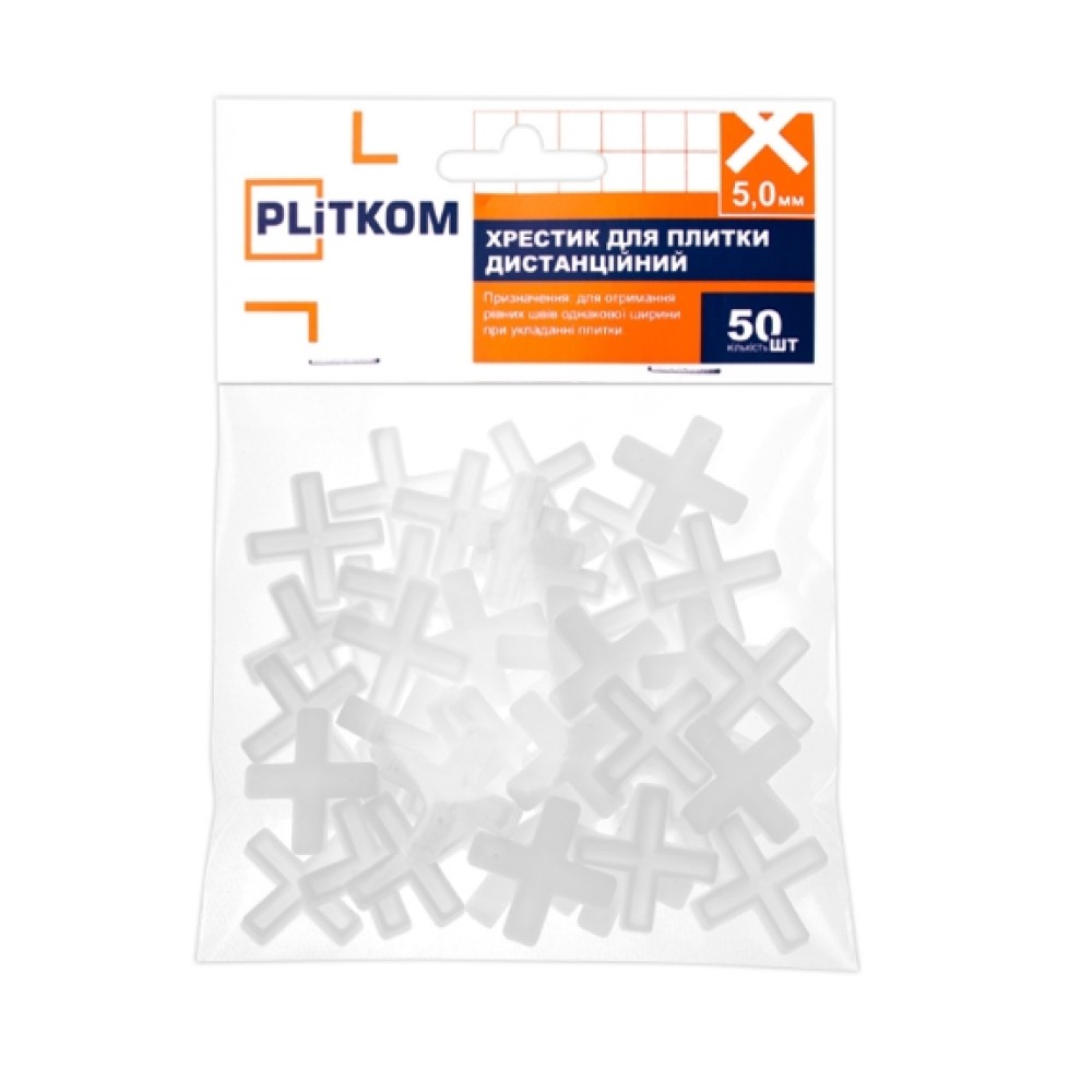Хрестик для плитки 5,0 мм - пластикове пристосування, яке застосовується для забезпечення рівних швів фіксованою товщини при укладанні керамічної плитки. Незалежно від товщини і кольору, хрестики виконують основну функцію: фіксують товщину шва між плитками. Чим вище якість кахлю, тим тонший шов можна робити. Видаляються хрестики легко, не залишаючи слідів на швах. Розпірки 5,0 мм продаються як окремо, так і в складі СВП. З ними рівномірна висота укладання та фіксація ширини швів гарантовані. Їх застосування дозволяє значно підвищити ефективність облицювальних робіт. Вставки під плитку 5,0 мм від Plitkom створюють рівномірні шви однакової товщини і вирівнюють похибки підстави.