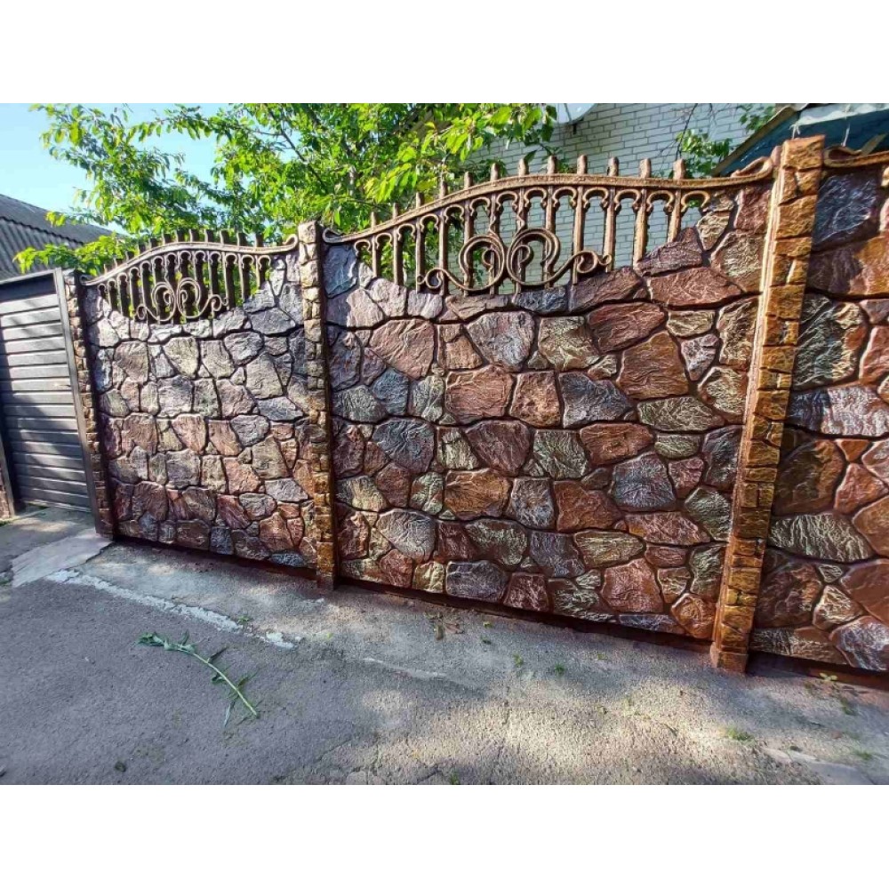 • Конструкція: Одностороння плита з рельєфним візерунком лише з одного боку, що спрощує її монтаж. Стандартні розміри дозволяють легко комбінувати її з іншими елементами єврозабору, створюючи різноманітні конфігурації та висоту огорожі.