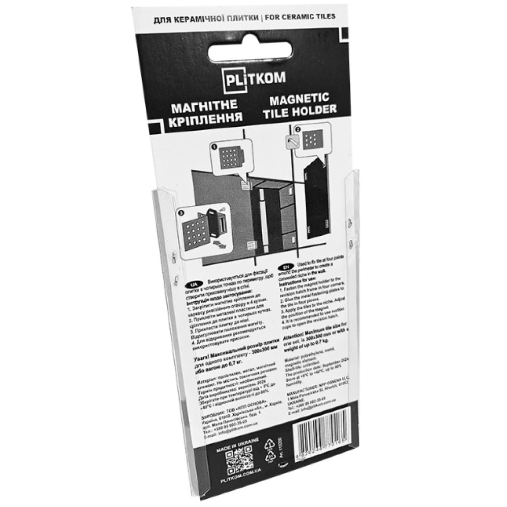 Магніт для плитки використовується для кріплення кахельної плитки під час монтажу ревізійного отвору для сантехнічних, опалювальних та вентиляційних систем. З його допомогою після установки плитки зберігається швидкий доступ до прихованих вузлів і комунікацій. "Прихований" монтаж магнітного кріплення має естетичний зовнішній вигляд. Даний аксесуар виготовляється з пластика і металу, тому зносостійкий і довговічний, може використовуватися навіть у вологих приміщеннях. Магнітне кріплення для плитки Plitkom має бездоганну якість.