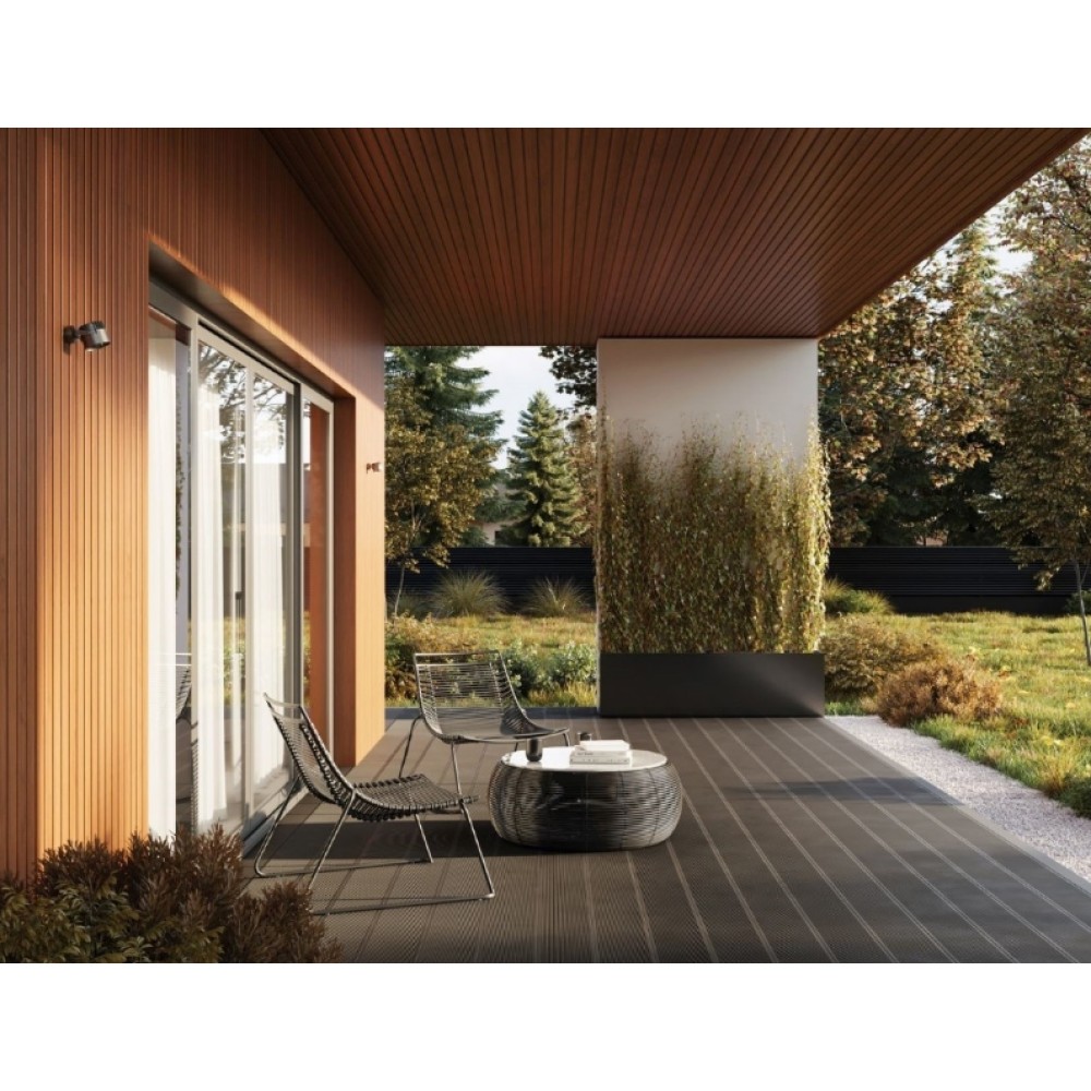 Панелі VOX Fronto MAX точно імітують деревину, створюючи естетику натурального матеріалу, але без його недоліків. Завдяки плоскій формі їх можна монтувати вертикально чи горизонтально, на фасадах і стелі. Поверхня стійка до подряпин, легко очищується та не вимагає фарбування.