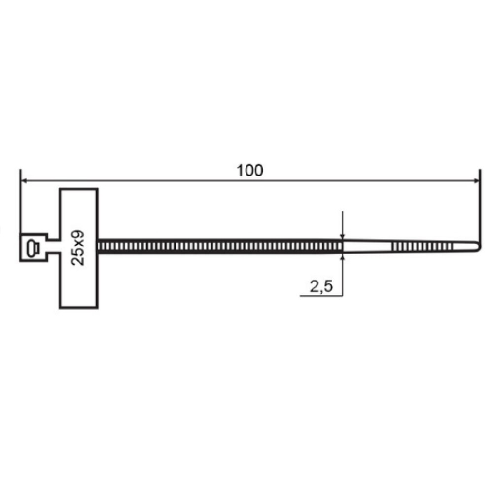 Хомут виготовлений з нейлону 66, що гарантує високу міцність та довговічність. Його діаметр охоплення складає 22 мм, а довжина хомута – 100 мм. Хомут має ширину 2,5 мм та розмір маркировочної площадки 25х9 мм, що дозволяє зручно нанести необхідну інформацію для маркування. Витримує експлуатаційні температури в діапазоні від -20 до +60 °C, що робить його придатним для використання в різних умовах.