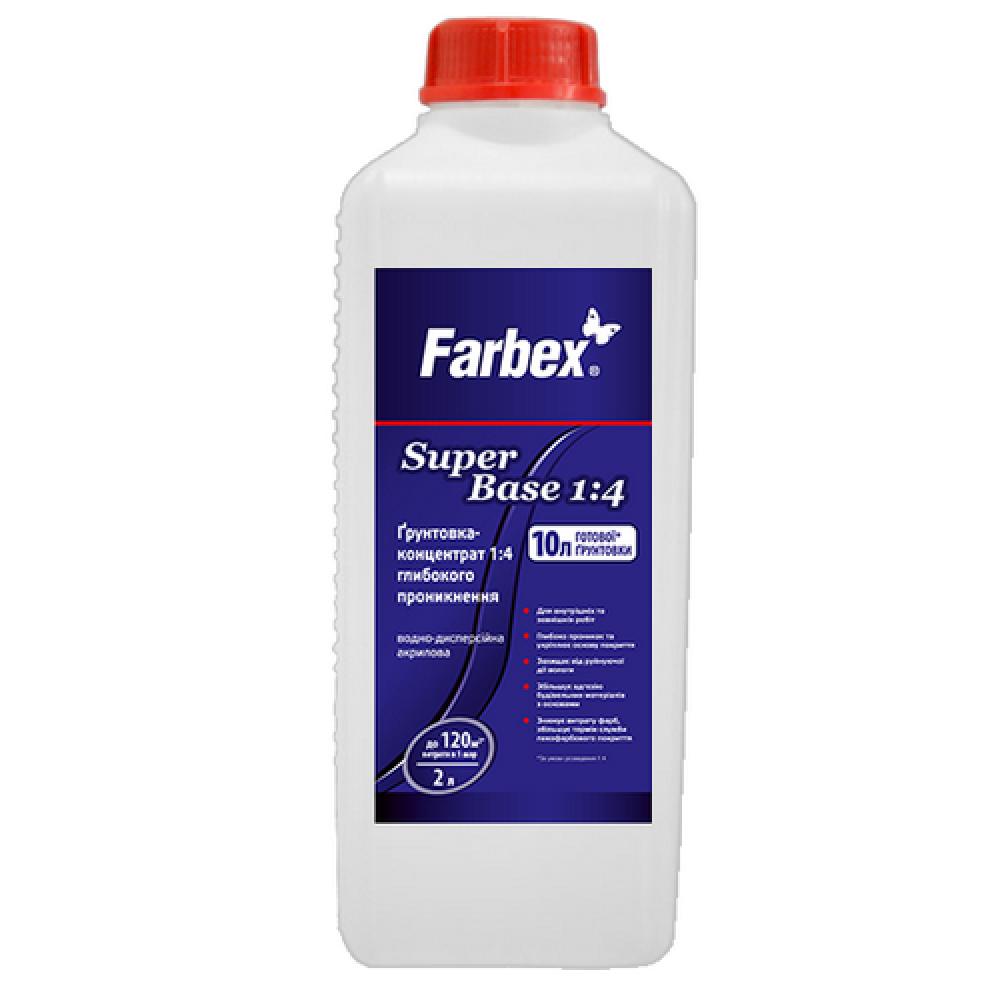 Грунт-концентрат Фарбес применяется для пропитки и грунтовки различных поверхностей (кроме металла) перед штукатурными, шпаклевочными работами, окрашиванием вододисперсионными красками, наклеиванием обоев и др. Грунтовка Фарбекс представляет собою акриловую дисперсию, является экологически чистой, глубоко проникает и укрепляет поверхности, выравнивает водопоглощение поверхностей, улучшает адгезию строительных смесей к основам, экономична в использовании.