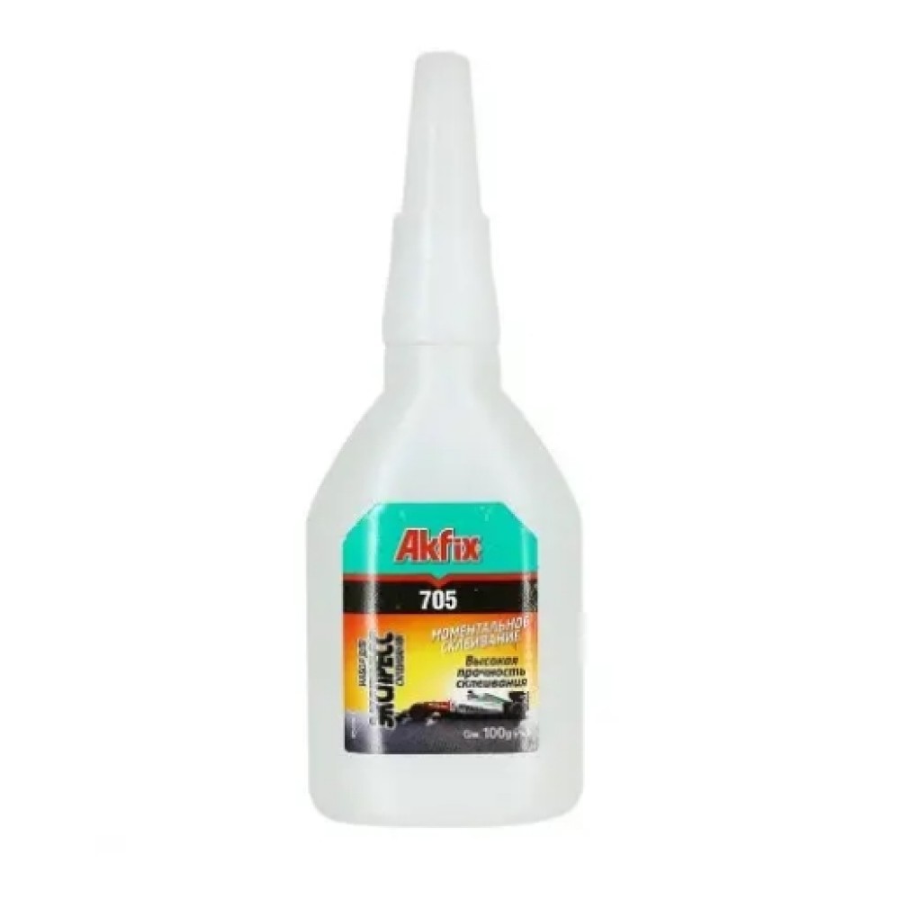 AKFIX 705 - високоякісний однокомпонентний готовий до застосування, універсальний швидко полимеризующийся клей, на цианокрилатной основі. Використовується для склеювання пористих матеріалів, порцеляни, кераміки, скла, слонової кістки, коштовного каміння, гуми, пластмас, еластомерів, паперу, картону, дерева, металів, ПВХ, а так само всіляких штучних матеріалів.
