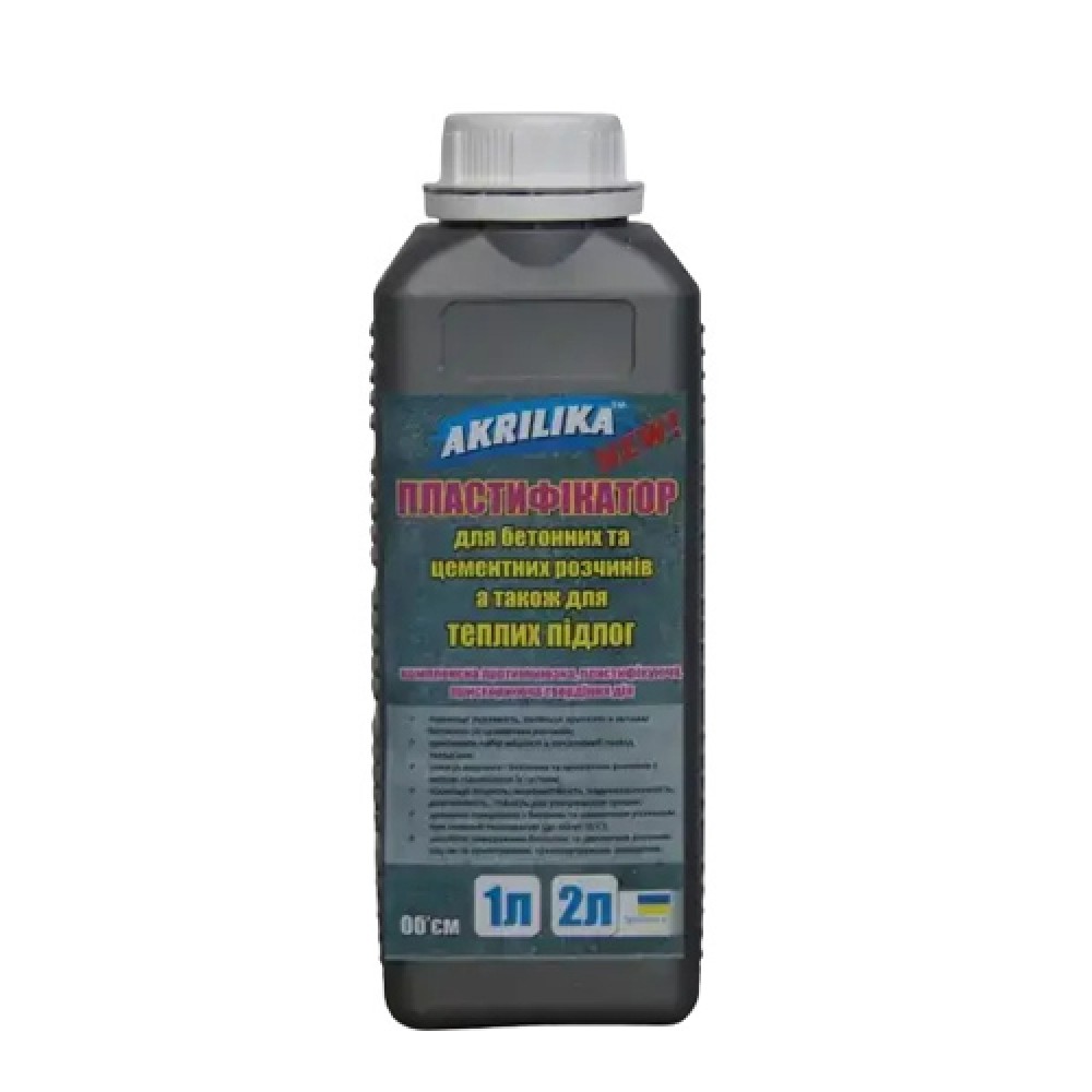 Akrilika Пластифікатор (Літо) - універсальна добавка до будь-яких видів бетону (армованого, неармованого), розчинів при влаштуванні монолітного будівництва, стяжок, кладок та інших видів будівельних робіт, походить для теплих підлог, 1 л