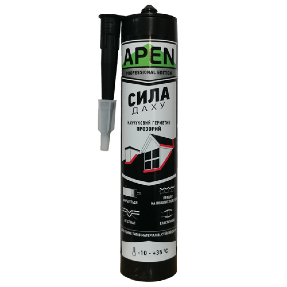 Apen (Апен) "Сила даху" - каучуковий покрівельний прозорий герметик. Робоча температура - від +5°C до +40°С, об `єм - 280 мл