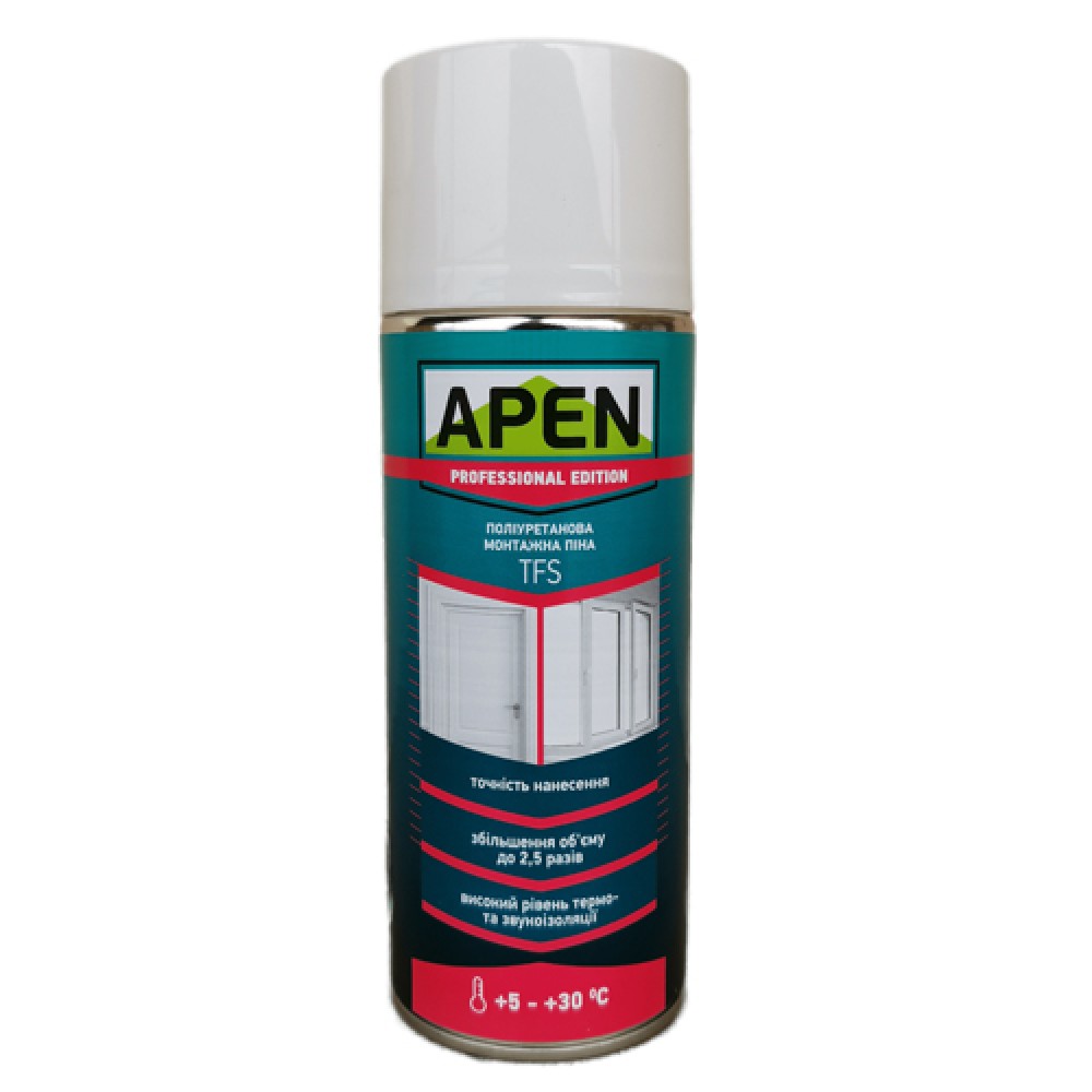 Піна Apen (Апен) TFS - побутова (ручна) поліуретанова піна з високим виходом. При низькому вторинному розширенні не деформує конструкції, дозволяє досягти рівномірної структури. Призначена для встановлення та ущільнення будівельних конструкцій, вікон і дверних коробок, заповнення отворів, ущільнення швів, ізоляції та кріплення труб, фіксації стінних панелей, черепиці, а також теплоізоляції. Відмінно склеює більшість будівельних матеріалів, за винятком тіл поверхонь. Застигла піна не переносить ультрафіолетове випромінювання та сонячне світло.
