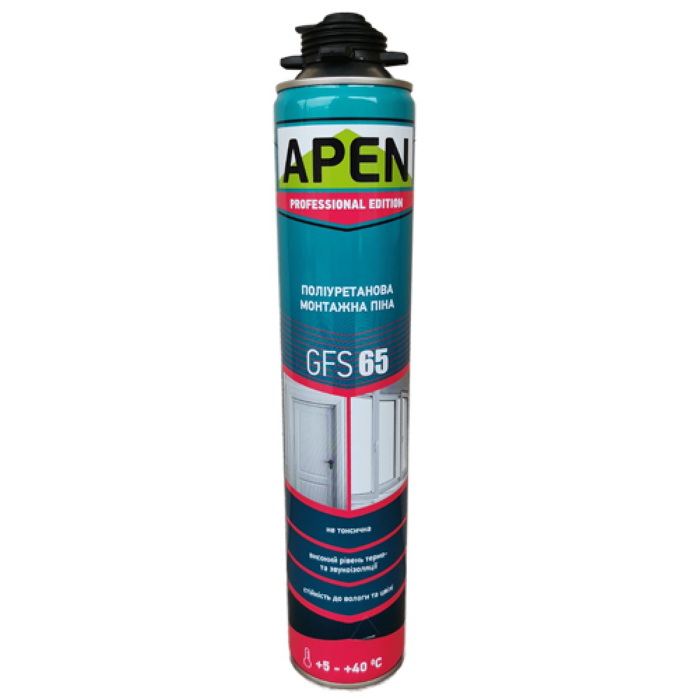 Піна монтажна професійна пістолетна Apen GFS 65 (Апен ГФС 65), літня– монтажна піна з максимальним виходом (до 65 л) і мінімальним розширенням, ідеально підходить для монтажу та ізоляції дверних коробок і віконних рам, заповнення порожнеч і щілин. Робоча температура - від +5°C до +40°С, об'єм - 780 мл