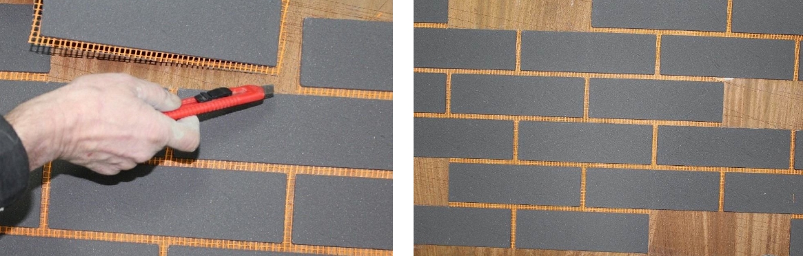 Після приклеювання модуля у вирізані місця вклеюємо поштучні елементи клінкеру інших кольорів заздалегідь вирізані з модулів іншого кольору або такі, що замовляються додатково.