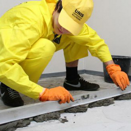 Наиболее распространенным способом для выравнивания пола является цементная стяжка по маякам. Маяк (маячная рейка) представляет собой ровную металлическую рейку, профиль которой имеет Т-образную форму. Выступ (носик) маяка может иметь высоту 6 и 10 мм, в зависимости от того какой минимальный слой стяжки требуется выполнить. Раствор для бетонирования основания может быть изготовлен самостоятельно, с использованием цемента М400 или М500, песка и воды, замешанных в нужной пропорции. Но более удобно, особенно если вы проводите такой ремонт впервые, купить готовую сухую стяжку, в состав которой уже включена вся необходимая строительная химия. Трещины, вздутия и другие дефекты в основаниях чаще всего являются результатом неправильного расчета состава раствора, в частности излишнего содержания в нем воды. Поэтому, даже если вы готовите ЦПС (цементно-піщана суміш) самостійно, для стяжки слід використовувати пластифікатори, що дозволяють отримати еластичний розчин, без додавання зайвого обсягу води.