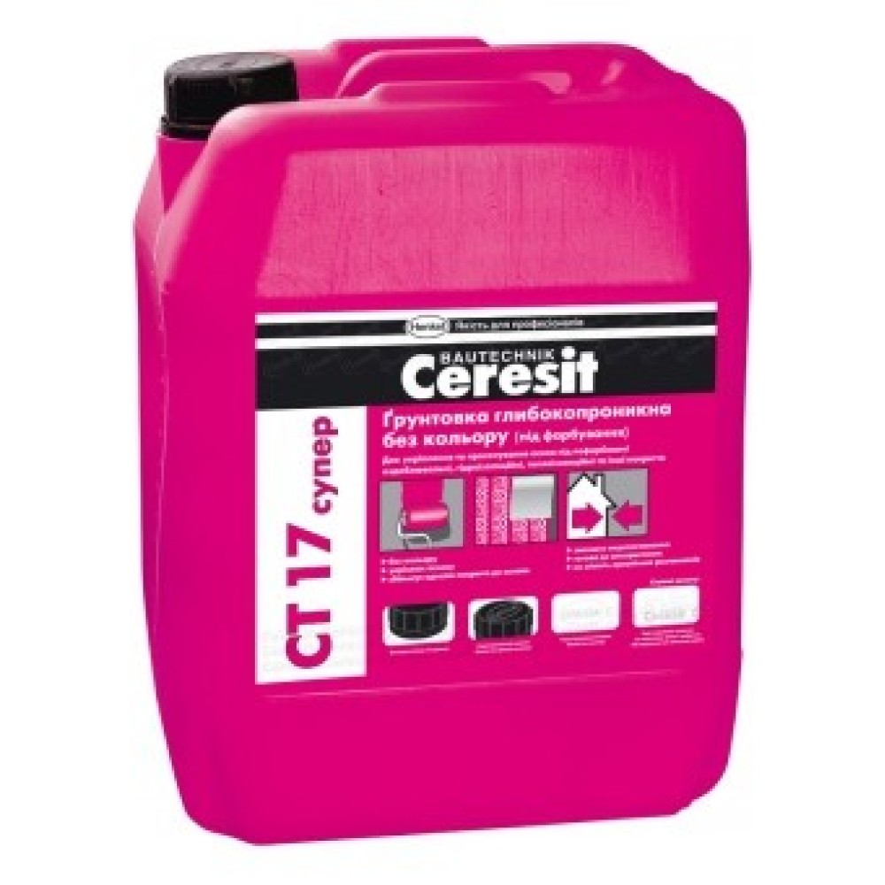 Грунтовка церезит СТ 17 Супер – это грунтовка глубокого проникновения (дисперсия на основе синтетических смол). Грунтовка СТ 17 Супер увеличивает адгезию к основаниям, уменьшает водопоглощение, не содержит органических растворителей, укрепляет основания. Грунтовка глубокого проникновения Церезит СТ 17 готова к применению, бесцветная. Расход – 0,15-0,2 л/м2.