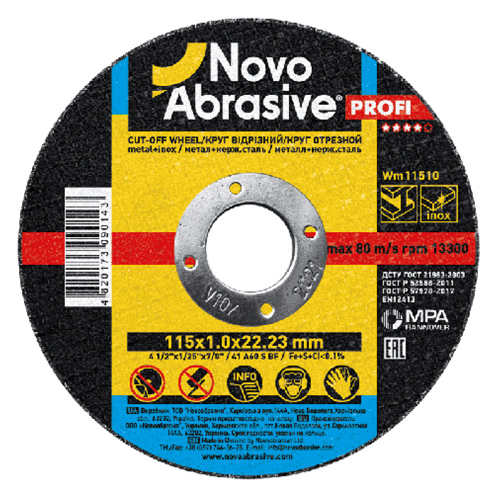 Універсальне відрізне коло NovoAbrasive (НовоАбразив) - професійний абразивний інструмент, призначений для обробки металу та нержавіючої сталі. Диски NovoAbrasive (НовоАбразив) виробляються в Україні на сучасному італійському обладнанні за італійською технологією. Відрізні круги по металу відповідають усім необхідним стандартам якості та безпеки: MPA Hannover, УкрСЕПРО, EAC, EN12413. Для виготовлення кіл NovoAbrasive Profi використовується електрокорунд підвищеної якості та спеціальні добавки для поліпшення відведення тепла із зони різу. деталей та заготовок, листового металу та інших матеріалів.