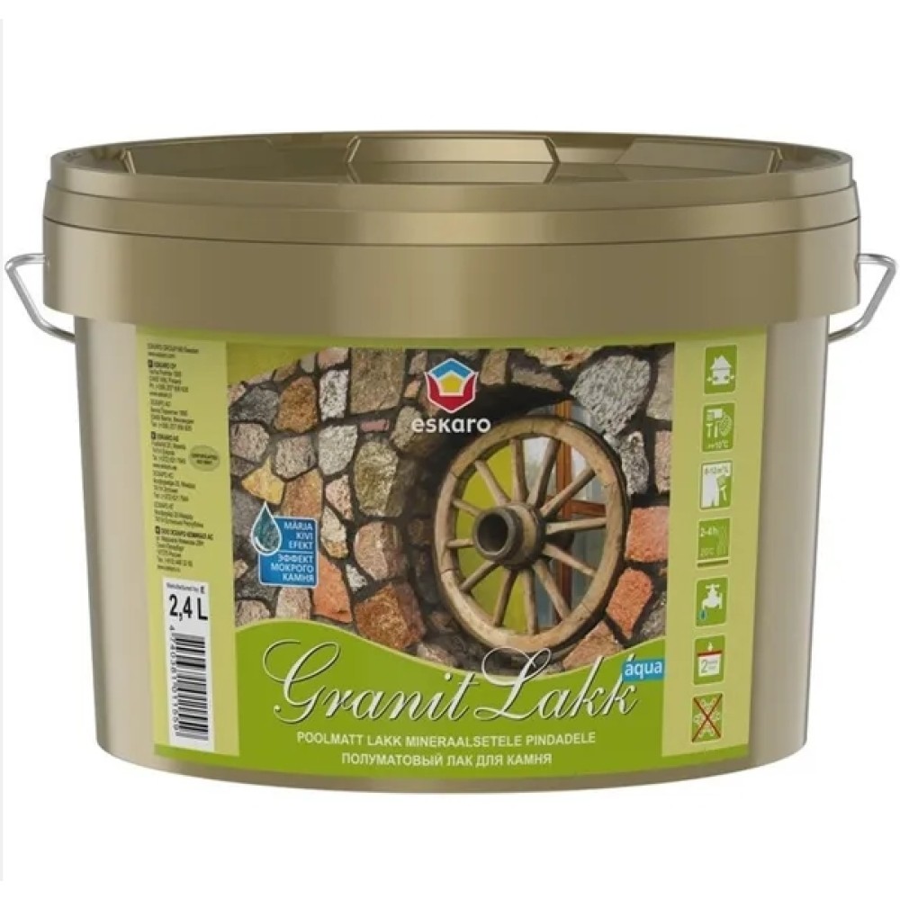 Eskaro Granit Lakk Aqua - лак відмінно захищає поверхні від ерозії, мохів, грибків і ультрафіолетових променів. При нанесенні добре заповнює мікротріщини та пори, тим самим запобігаючи розтріскуванню та негативному впливу вологи. Не змінює природний колір каменю, зберігаючи при цьому первозданну красу та текстуру. Після висихання легко миється та очищається від бруду та пилу як зовні, так і всередині приміщення. Є протигрибковим гідрофобним засобом.