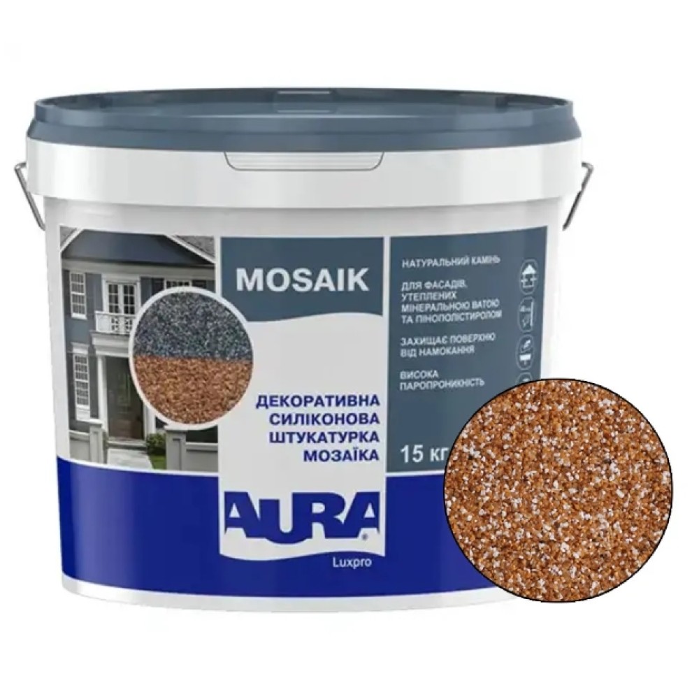 Aura Luxpro Mosaik — це готова до застосування декоративна мозаїчна штукатурка на акриловій основі, модифікована силіконом та з натуральним кам'яним наповнювачем. Вона призначена як для зовнішніх, так і для внутрішніх робіт. Завдяки своїм властивостям, вона особливо підходить для поверхонь, що піддаються високим експлуатаційним навантаженням та впливу атмосферних опадів, таких як цоколі будівель, промислові зони, а також стіни сходових маршів усередині приміщень.