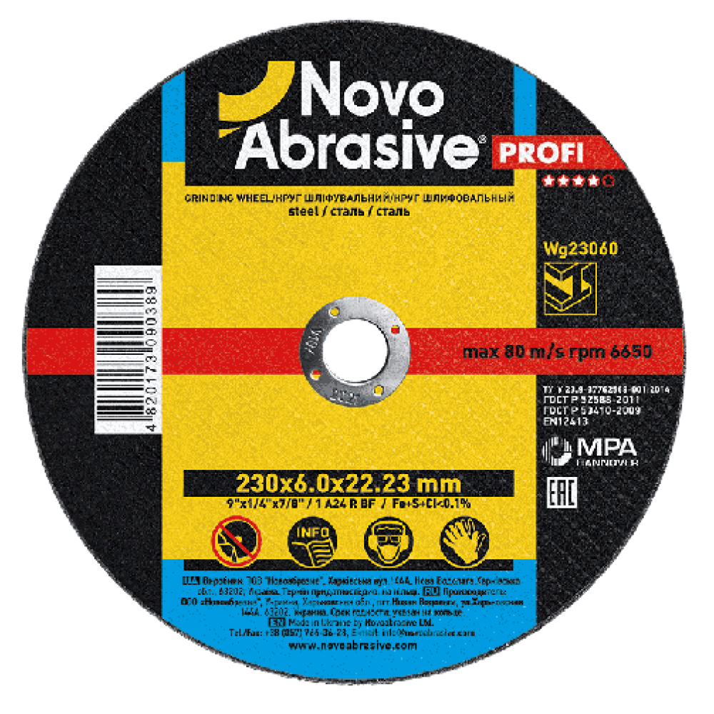 Універсальне шліфувальне коло NovoAbrasive (НовоАбразив) – професійний абразивний інструмент, призначений для обробки металу та нержавіючої сталі. Диски NovoAbrasive (НовоАбразив) виготовляються в Україні на сучасному італійському обладнанні за італійською технологією. Шліфувальні круги по металу відповідають усім необхідним стандартам якості та безпеки: MPA Hannover, УкрСЕПРО, EAC, EN12413. В основі кіл NovoAbrasive Profi використовується електрокорунд підвищеної якості та спеціальні добавки для покращення відведення тепла із зони різу. Шліфувальні круги застосовуються на кутошліфувальних машинах (болгарка) для шліфування та зачистки зварних швів, а також зняття іржі з різних деталей та заготовок.