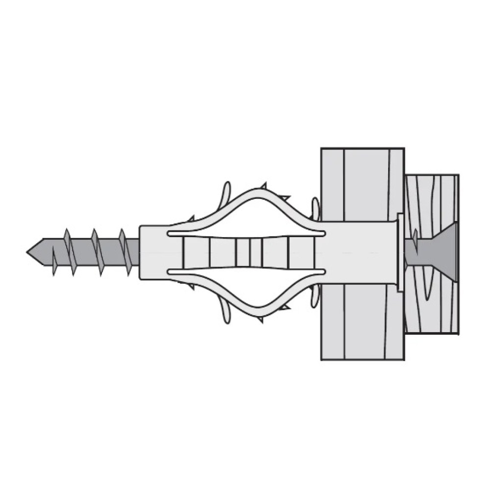 - Дюбель з чотиристороннім розпором, має вусики, що перешкоджають прокручування дюбеля в просвердленому отворі на початку монтажу (дуже актуально для застосування в газобетоні і пінобетоні).