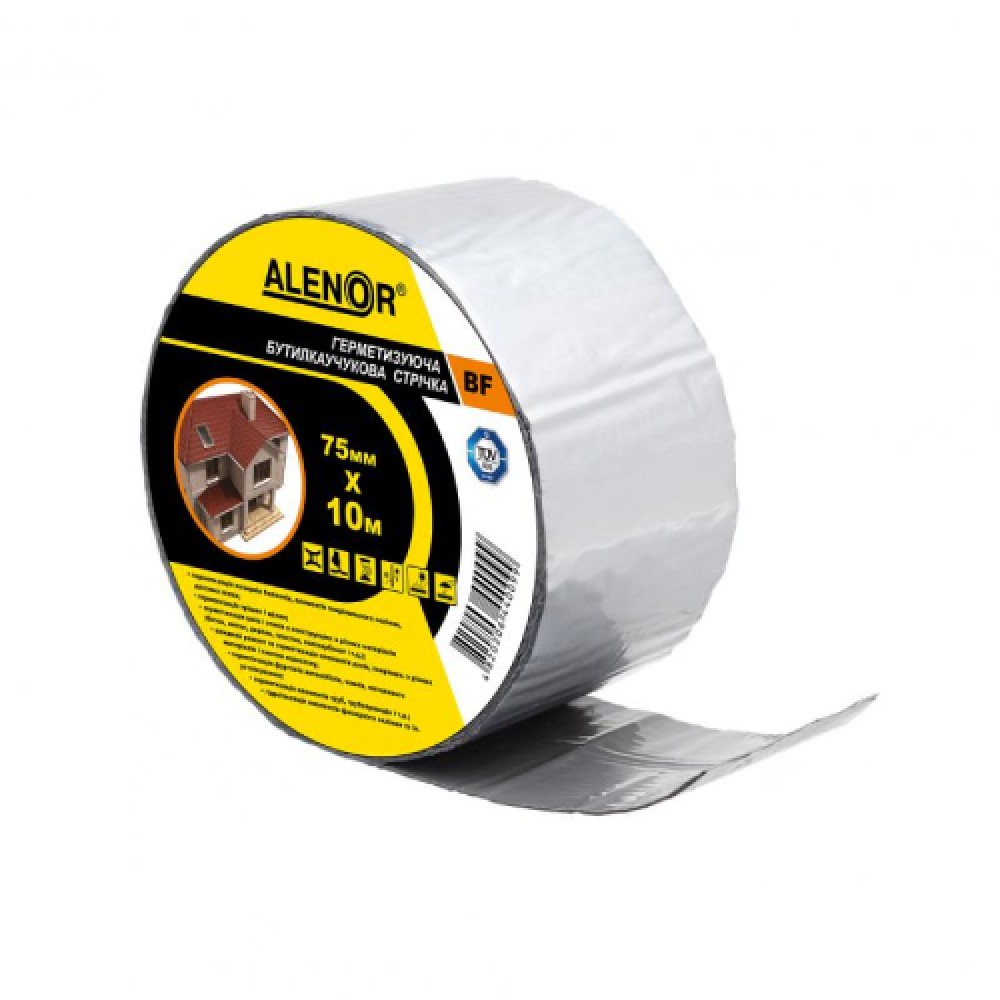 ALENOR BF - стрічка для ремонту покрівлі, герметизуюча, фольгована, на основі бутилкаучуку постійної липкості із захисною антиадгезійною плівкою, колір алюміній, розмір 75 мм х 10 м