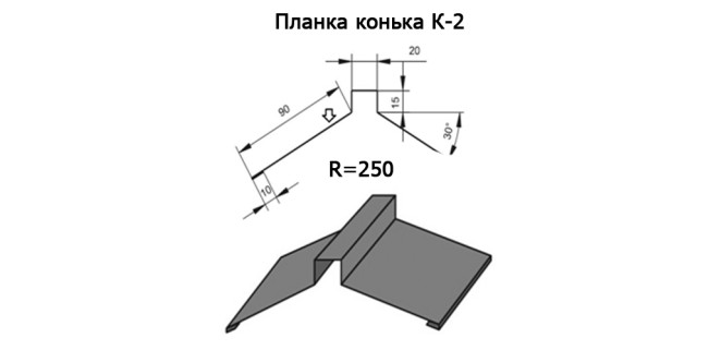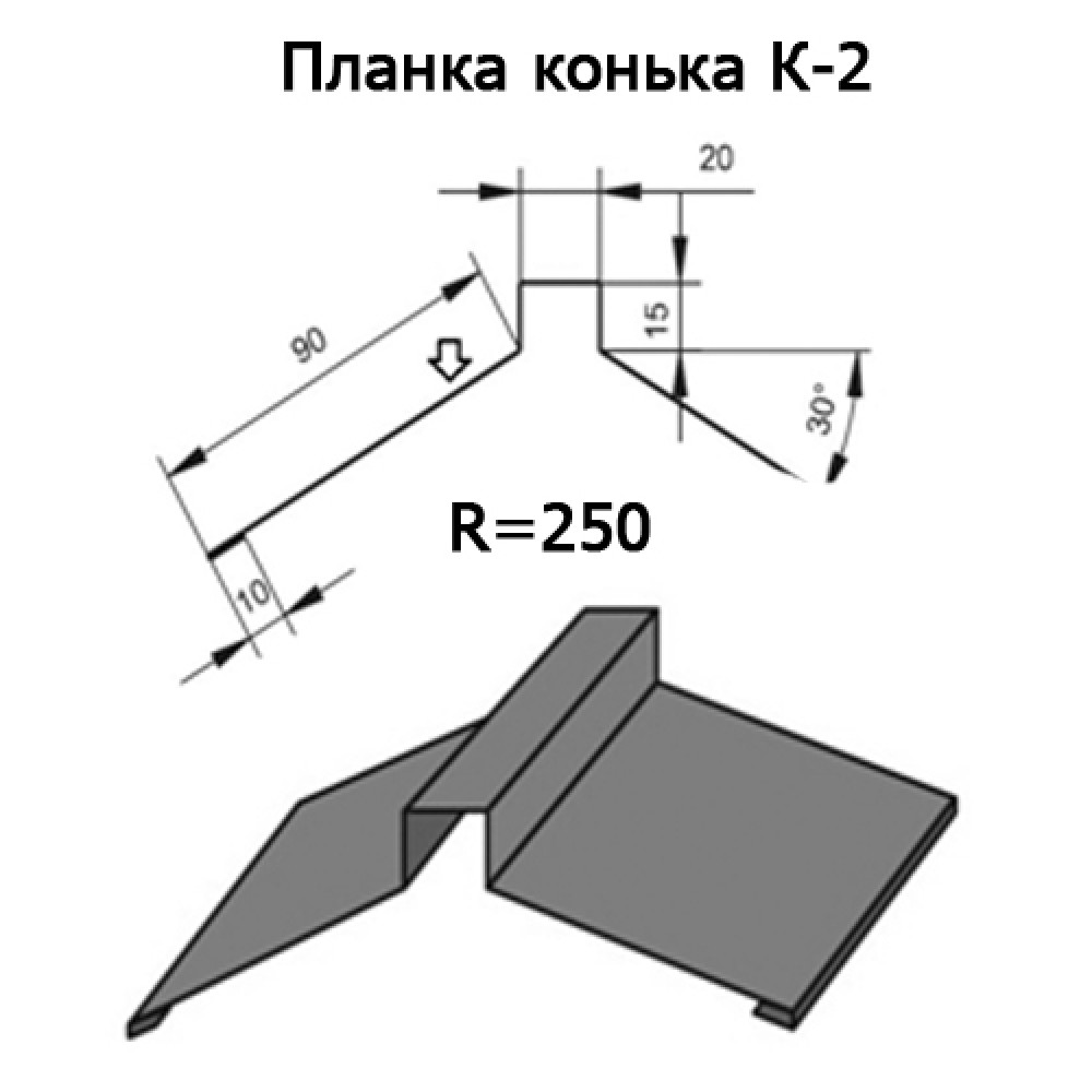 Планка для профнастила – планка конька К-2 R=250 длина 2м, металл – цинк, 0,45мм