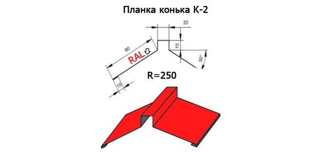 Планка для профнастила – планка конька К-2, R=250, длина 2м, покрытие - матполиэстер, толщина металла 0,47мм