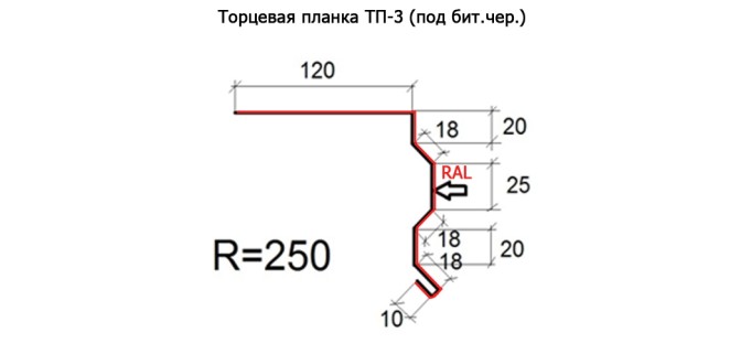 Торцевая планка ТП-3 (под бит.чер.) R=250,  длина 2м, покрытие - полиэстер, толщина металла 0,45мм