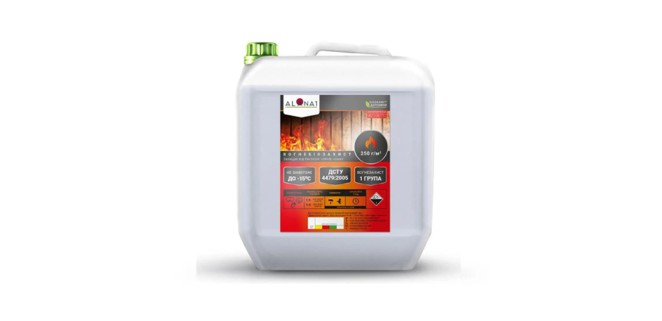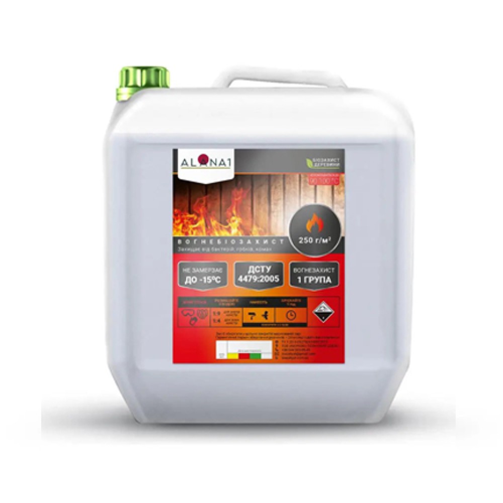 Засіб вогнебіозахисний для деревини АЛАНА-1 - сертифіковане вогнебіозахисне просочування для захисту деревини, вогнезахист №1, 1 група, працює при -15ₒС. Безбарвний або тонований червоним пігментом, 5 кг