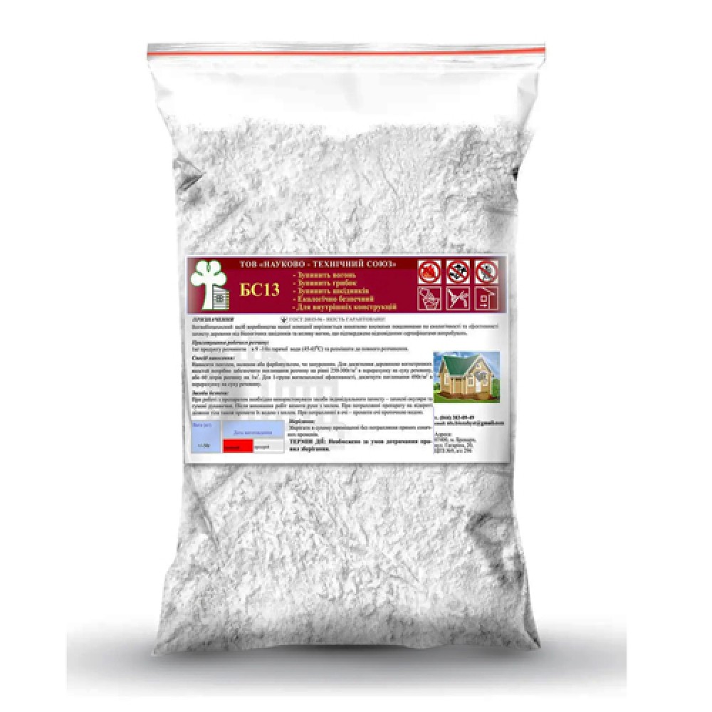 АЛАНА БС-13 - кристалічний антисептик, вогнезахисний, сухий концентрат 1:9. Безбарвний, або тонований у червоний пігмент. Захист до 25 років, 1 кг