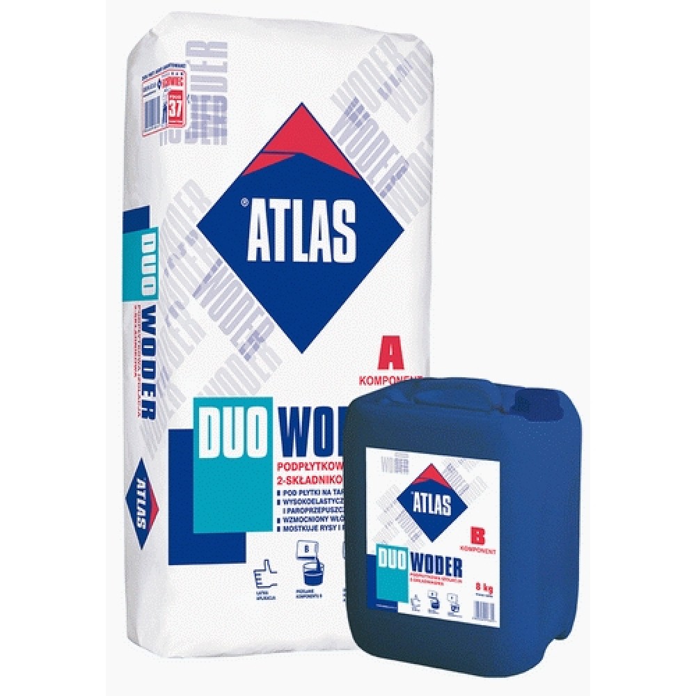 ATLAS WODER DUO виробляється у вигляді двокомпонентного гідроізоляційного продукту на основі цементу, мінеральних заповнювачів і модифікуючих добавок (суха суміш компонент A), а також водної дисперсії штучних речовин (емульсія компонент) B).