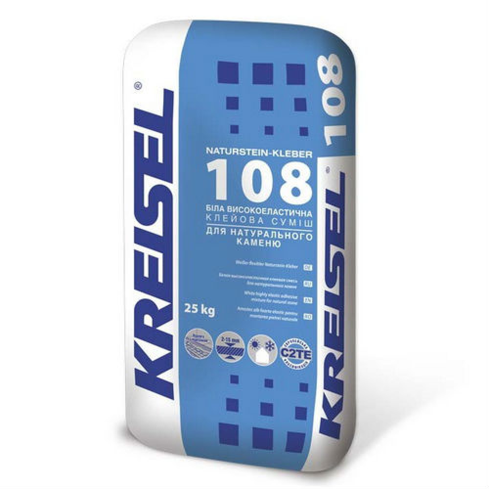 Білий еластичний клей для натурального каменю Kreisel 108 - клей для плитки та каліброваних плит з натурального каменю, а також керамічної плитки заводського виготовлення у вигляді сухої суміші сполучних, мінеральних заповнювачів та модифікованих добавок. Після замішування водою утворює білу, однорідну масу. Після затвердіння водо- та морозостійкий. Завдяки доданню траса та інших спеціальних компонентів, клей має властивості, що запобігають зміні забарвлення каменя та появі висолів. Відрізняється високою еластичністю, адгезією та широким спектром застосування.