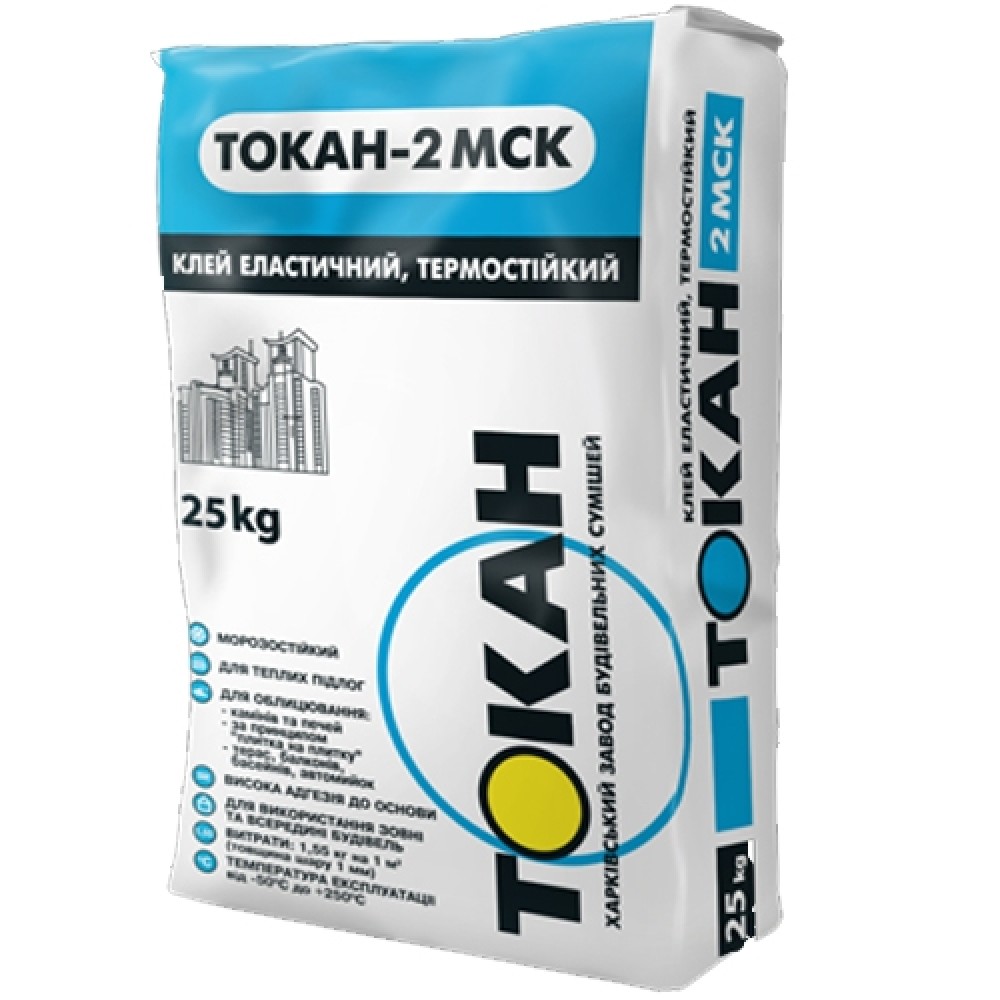 Еластичний клей для плитки Токан-2 МСК застосовується для облицювання керамічною, скляною плиткою, плиткою із природного каменю поверхонь підлоги та стін із бетону, цегли, цементно-піщаного розчину, гіпсокартону, ДСП та ДВП. Можливе застосування для облицювальних робіт "плитка на плитку", терас, балконів, автомийок. Застосовується для облаштування покриттів теплої підлоги на підставах з незначною деформацією. Має високу склеювальну здатність при достатній пластичності.