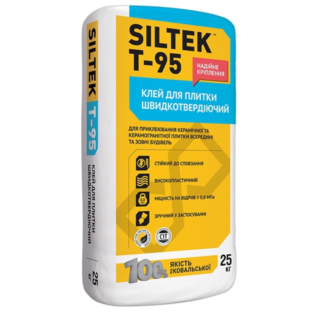 Клей для плитки быстротвердеющий SILTEK Т-95 применяется для облицовки всех видов минеральных горизонтальных и вертикальных поверхностей, в том числе повышенной прочности, внутри и снаружи помещений, керамической и другими видами плитки (кроме мраморной). Клей Силтек Т-95 эффективен для уменьшения сроков облицовочных работ при строительстве и реконструкции зданий. Рекомендуется использовать смесь Силтек Т-95 при локальном срочном ремонте облицовки. Быстротвердеющий клей для плитки SILTEK Т-95 эффективен для плит большого размера, подходит для систем водного подогрева пола, прочность на отрыв через 28 суток ≥ 1,0 МПа; возможность технологического перемещения и расшивки швов через 3 часа. Быстротвердеющий клей для плитки SILTEK Т-95 состоит из смеси минеральных вяжущих, фракционированных заполнителей, модифицирующих добавок.