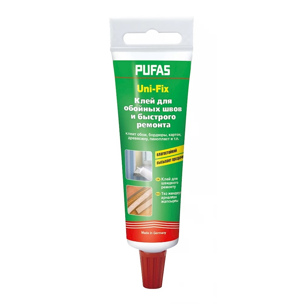 Uni-Fix Клей для швів та швидкого ремонту застосовується для ремонту швів між шпалерами, а також для наклеювання та ремонту таких матеріалів як текстиль, стиропор, ПВХ, картон, дерево, папір і т.п. всередині приміщень. Висихає прозорим, вологостійким і не жовтіє.