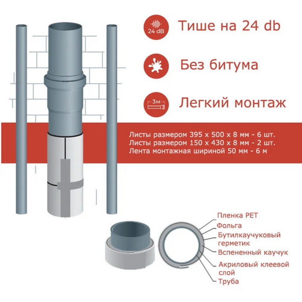Комплект акустичної ізоляції водовідведення NSP SOFT PRO (звукоізоляція каналізаційної труби) для усунення шуму у пластикових каналізаційних трубах діаметром 110 мм та висотою до 3 метрів, товщина ізоляції 12 мм