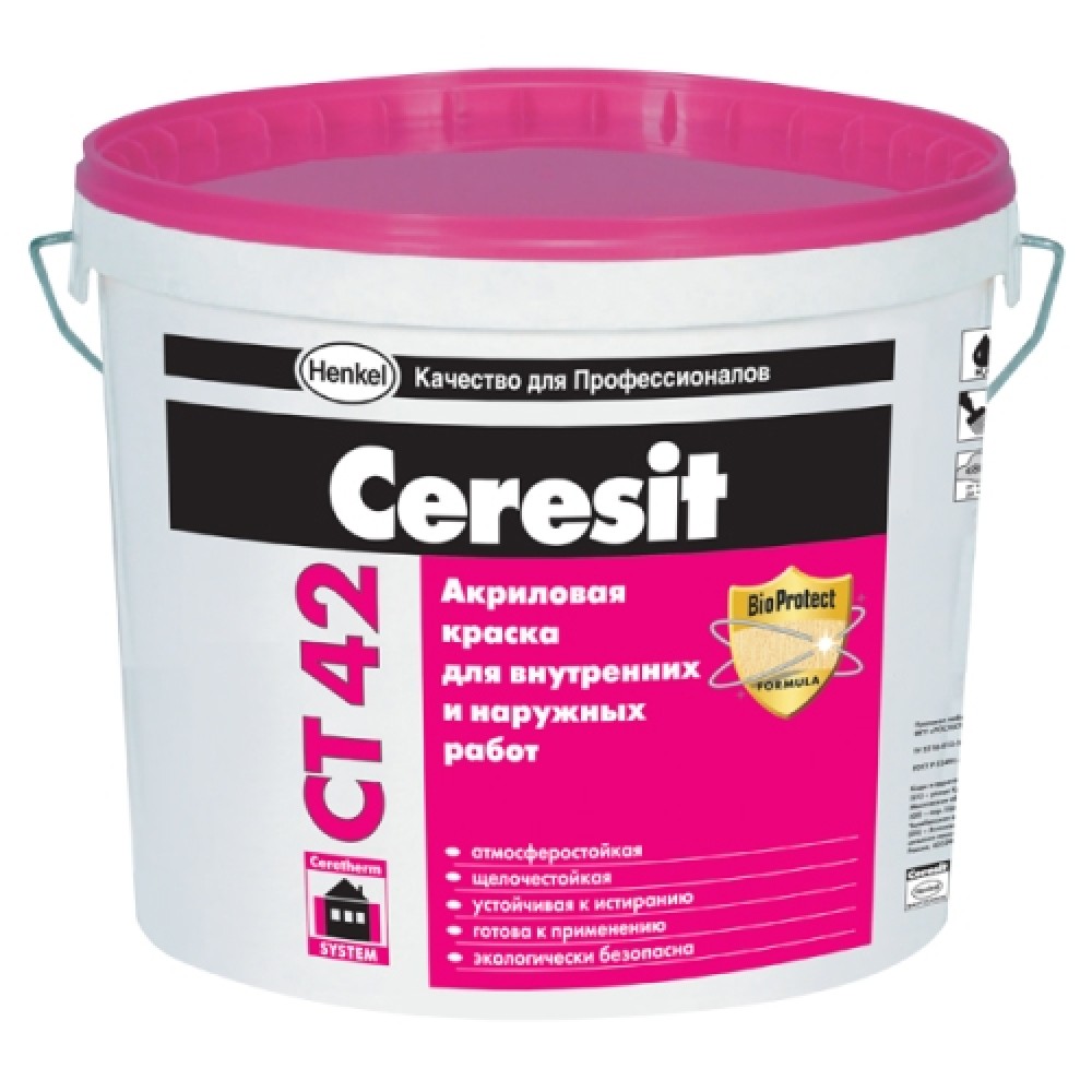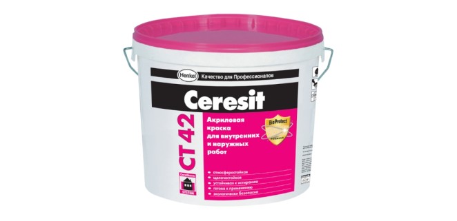 Церезит СТ-42 – акрилова (водно-дисперсійна) біла фарба (може цвітатися), для зовнішніх та внутрішніх робіт. Фарба церезит СТ 42 є паропроникною, атмосферо- та лугостійкою, екологічно безпечною. Акрилова фасадна фарба церезит СТ 42 застосовується для обробки мінеральних основ (бетон, цегла, цементні та вапняні штукатурки), мінеральних та акрилових штукатурних покриттів усередині та зовні будівель. Також застосовується при виконанні систем теплоізоляції пінополістирольними плитами. НЕ придатна для фарбування підлоги. Дозволяється промивання пофарбованої поверхні водою під невеликим тиском.