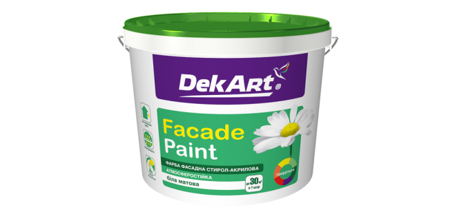 Водоэмульсионная матовая акриловая фасадная краска DekART Faсade рекомендована для применения снаружи помещений – для окраски фасадов любых видов зданий. Предназначена для окраски цементных и цементно-известковых штукатурок, бетона, кирпича, деревянных и гипсовых поверхностей, шлакоблока и др.