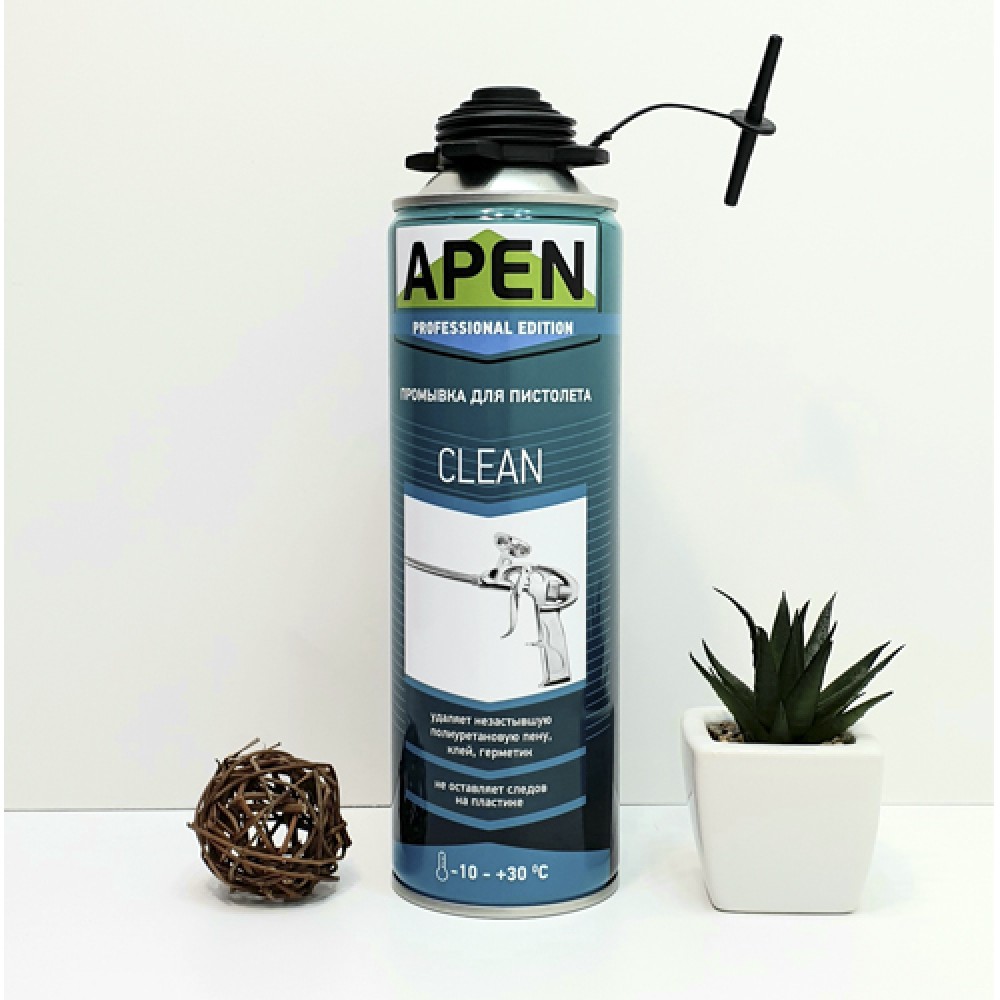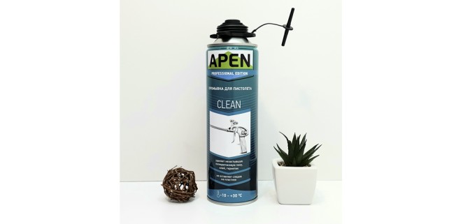 Очищувач Apen (Апен) Clean - спеціально сконструйований для чищення пістолета для піни. При використанні очищувача натиснути спуск кілька разів, щоб очистити наповнювач і кінчик, очищувач має вентиль для пістолета, який можна використовувати для видалення свіжої піни з адаптера пістолета. Ефективно видаляє частини незастиглої піни з тканини, віконних рам, пістолетів для піни