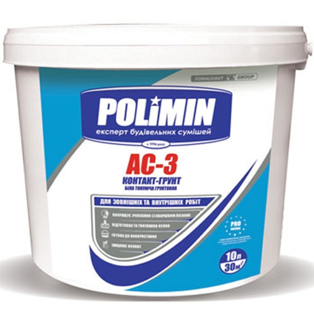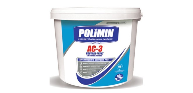 Ґрунт-фарба Полімін АС-3 — ґрунтовка тонувальна, призначена для обробки та зміцнення цементно-вапняних, вапняних і гіпсових штукатурок, підготовленого бетону, гіпсокартону, МДФ, ДСП, ДВП, OSB перед нанесенням штукатурок, шпаклівок, в т. ч. декоративних, структурних фарб всередині та зовні приміщення.