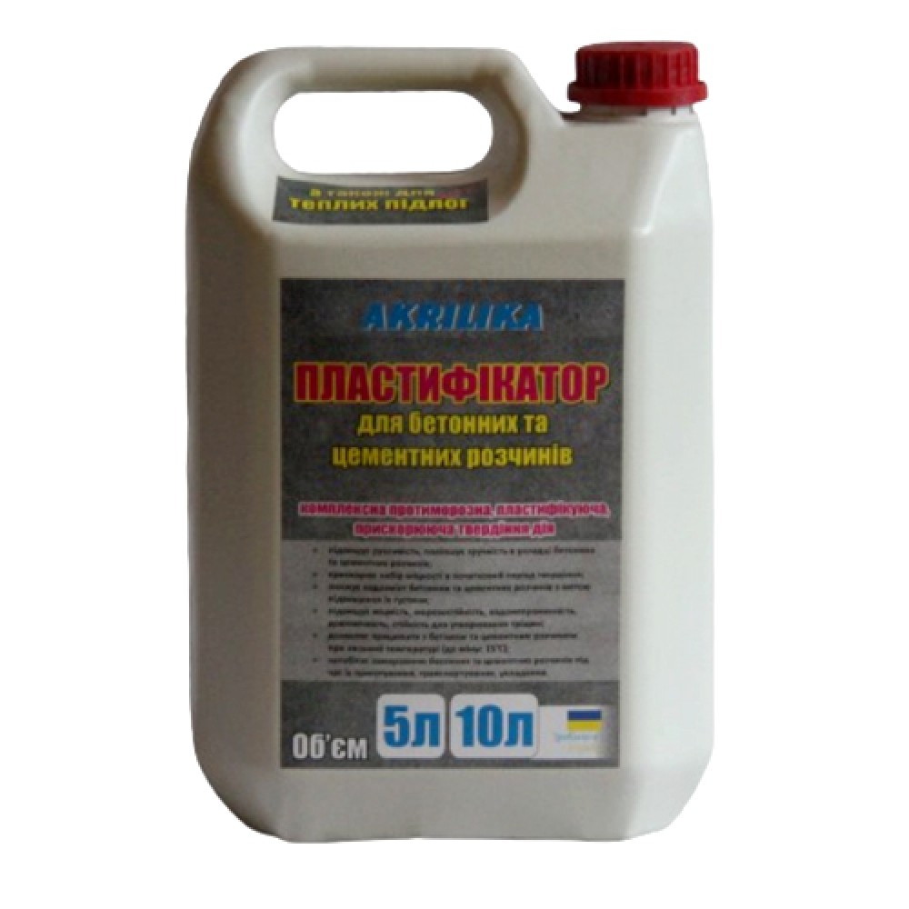 Akrilika Пластифікатор (Зима) - універсальна добавка до будь-яких видів бетону (армованого, неармованого), розчинів при влаштуванні монолітного будівництва, стяжок, кладок та інших видів будівельних робіт, походить для теплих підлог, 10 л