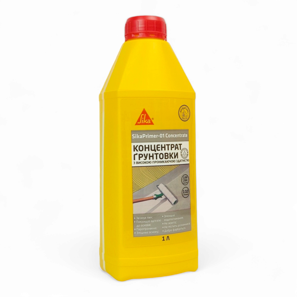 Sika Primer-01 Concentrate – це однокомпонентний, водний, дисперсний розчин полімеру білої акрилової смоли, який застосовується для ґрунтування та герметизації бетонних та цементних основ перед нанесенням стяжки, шпаклівки, приклеюванням плитки, шпалер та перед фарбуванням стін.