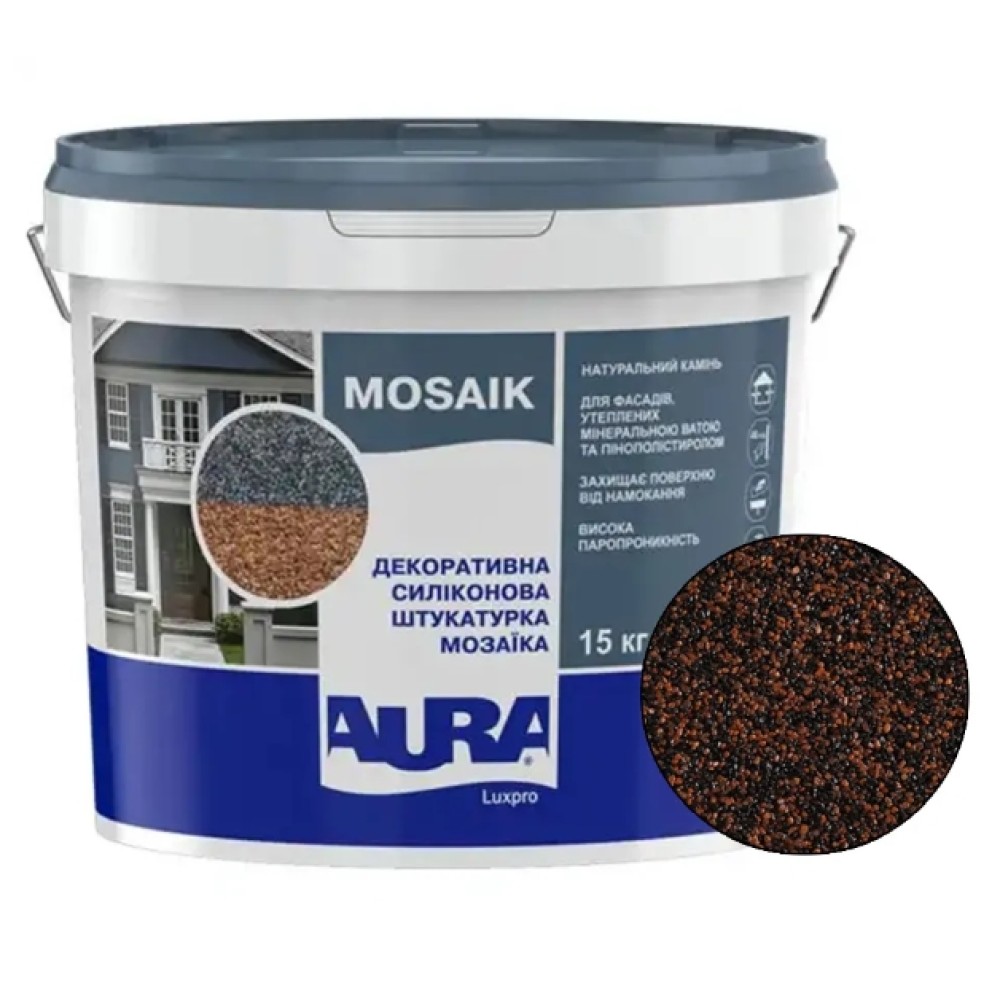 Aura Luxpro Mosaik — це готова до застосування декоративна мозаїчна штукатурка на акриловій основі, модифікована силіконом та з натуральним кам'яним наповнювачем. Вона призначена як для зовнішніх, так і для внутрішніх робіт. Завдяки своїм властивостям, вона особливо підходить для поверхонь, що піддаються високим експлуатаційним навантаженням та впливу атмосферних опадів, таких як цоколі будівель, промислові зони, а також стіни сходових маршів усередині приміщень.