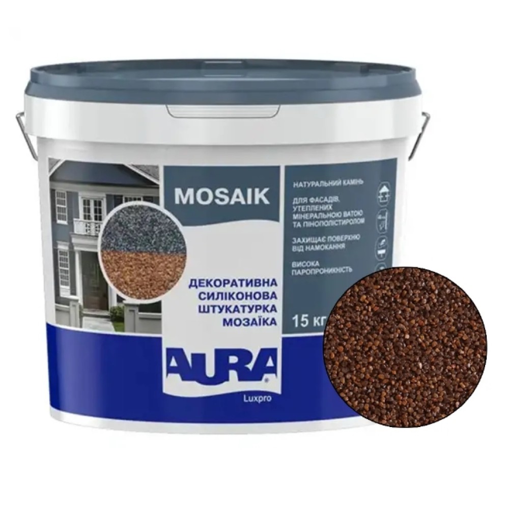 Aura Luxpro Mosaik — це готова до застосування декоративна мозаїчна штукатурка на акриловій основі, модифікована силіконом та з натуральним кам'яним наповнювачем. Вона призначена як для зовнішніх, так і для внутрішніх робіт. Завдяки своїм властивостям, вона особливо підходить для поверхонь, що піддаються високим експлуатаційним навантаженням та впливу атмосферних опадів, таких як цоколі будівель, промислові зони, а також стіни сходових маршів усередині приміщень.